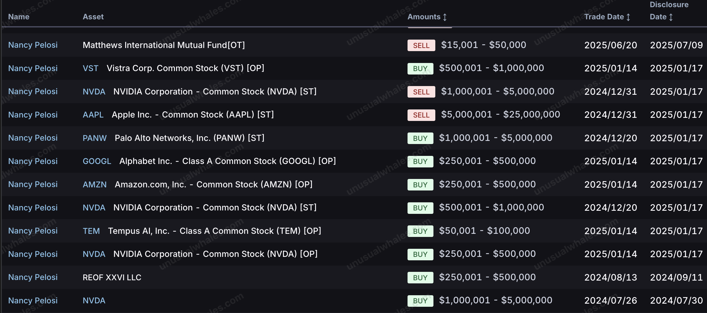 当然,国会山股神的交易并非秘密。根据2012年通过的《股票法案》要求,国会成员必须在交易后的45天之内,报告其交易。如果你访问 unusualwhales.com 这个网站,就能追踪到南希.佩洛西的所有交易。