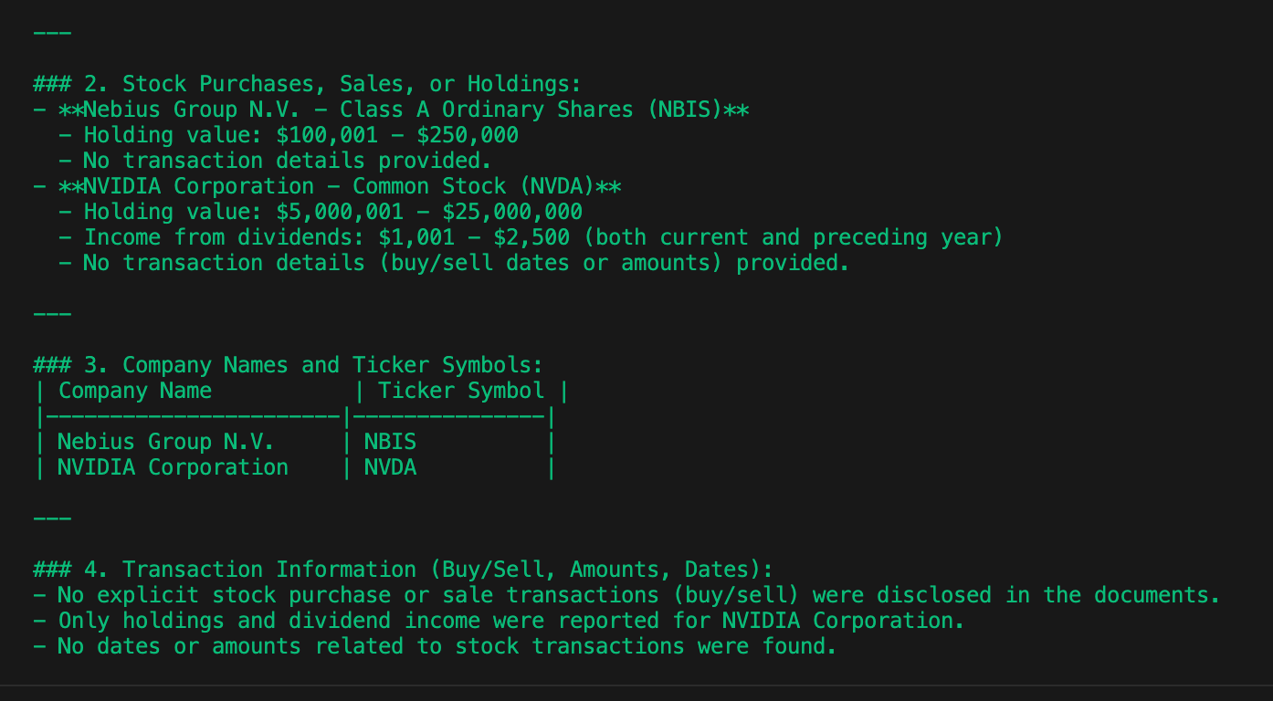 从技术上看,它是一个基于 python 的工具,依赖于 poppler-utils 和 pdf2image(这两个都是用于 pdf 文件处理),自动处理众议院财务批露的 PDF文件,然后依赖 OpenAI来分析这些文件。这里用到了 OpenAI vision API。所以,如果在国内不便访问 OpenAI,可以用 deepseek ocr 等模型来替代。不过,自己需要修改一下接口。