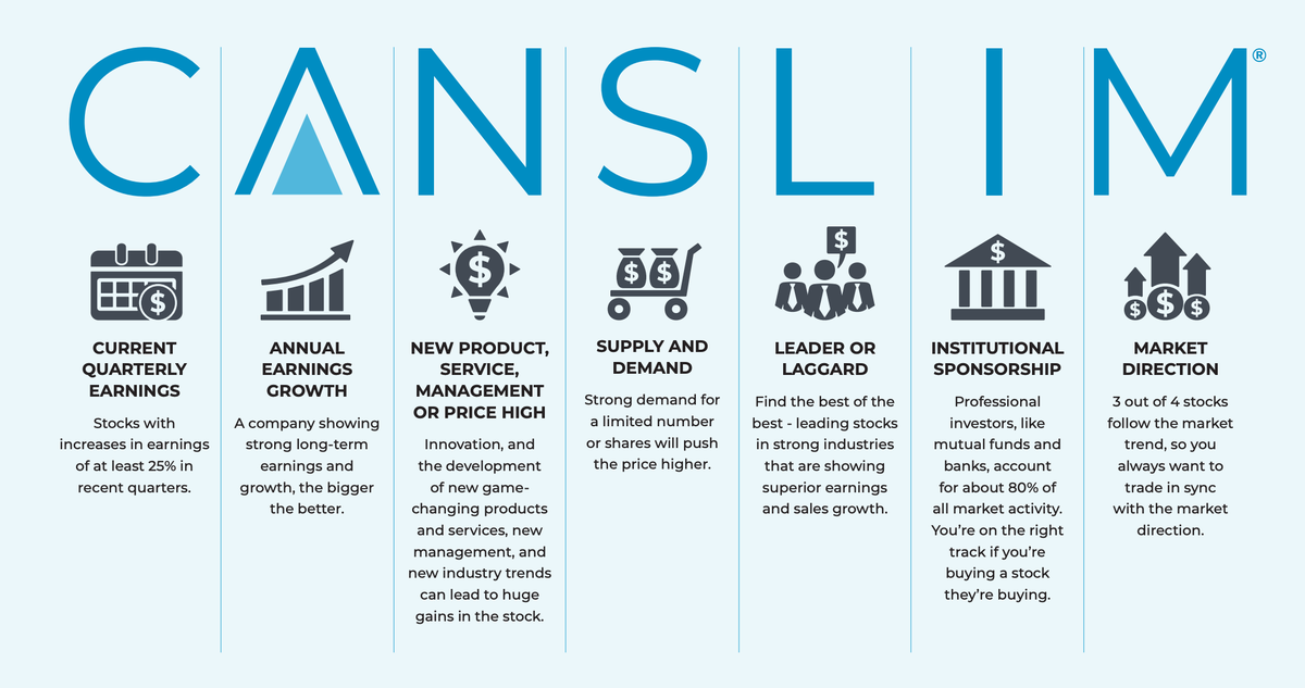 这个项目另一个有趣的地方,是它引入了 CANSLIM 投资模型。CANSLIM 是威廉.奥尼尔提出的一套经典成长股投资策略,核心是通过 7 个关键维度筛选具有高增长潜力、能持续跑赢市场的优质股票,本质是 “基本面 + 技术面” 结合的选股框架。